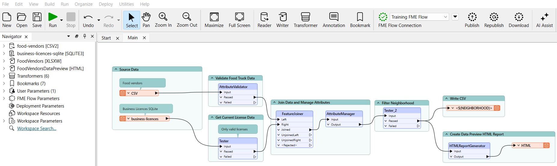 With his webhook copied, Frank opens his workspace (C:\FMEData\Workspaces\CreateDataIntegrationApps\FoodVendorBusinesses.fmw) in FME Workbench. The workspace reads Food Vendors and Business Licenses, joins them on the Business Name attribute, filters the vendors by a neighborhood set with a user parameter, then writes a CSV and an HTML report with the data.