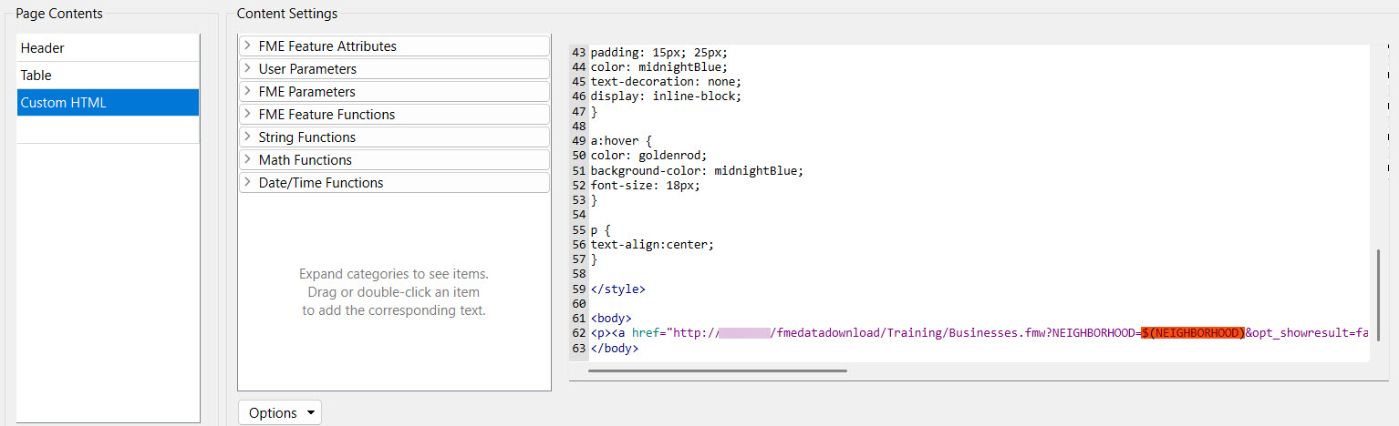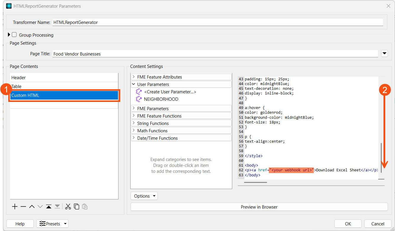 Frank will link his workspace webhook in the HTML report, so he opens the HTMLReportGenerator settings by double-clicking the transformer. Under Page Contents, Frank selects Custom HTML and then scrolls to the bottom of the HTML code to the body section.