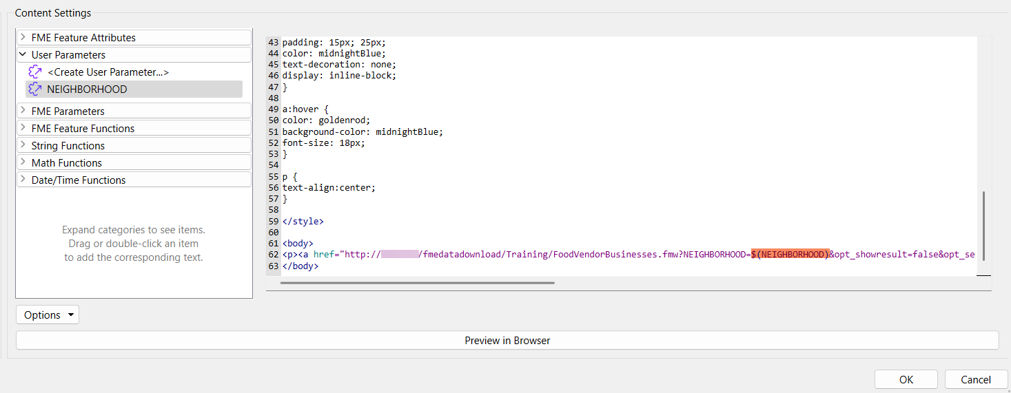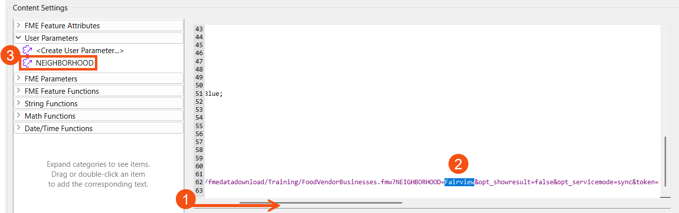 Once he pastes the URL, he scrolls to the right in the text to find the NEIGHBORHOOD parameter. He selects the default parameter value and replaces it with the NEIGHBORHOOD user parameter by double-clicking it in the left pane in Content Settings.