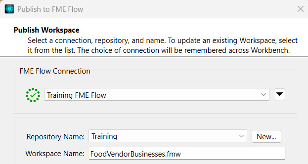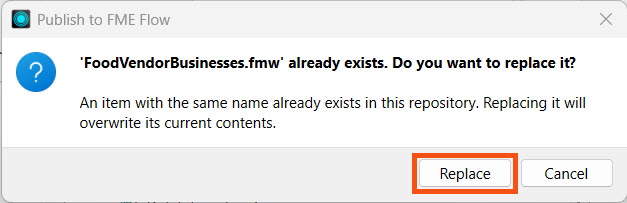 Frank publishes his workspace to FME Flow. He replaces his existing workspace, FoodVendorBusinesses.fmw, in the Training repository by overwriting it.