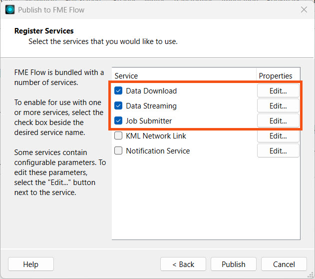 Next, Frank ensures Data Download, Job Submitter, and Data Streaming are all selected for the Register Services step and clicks Publish.
