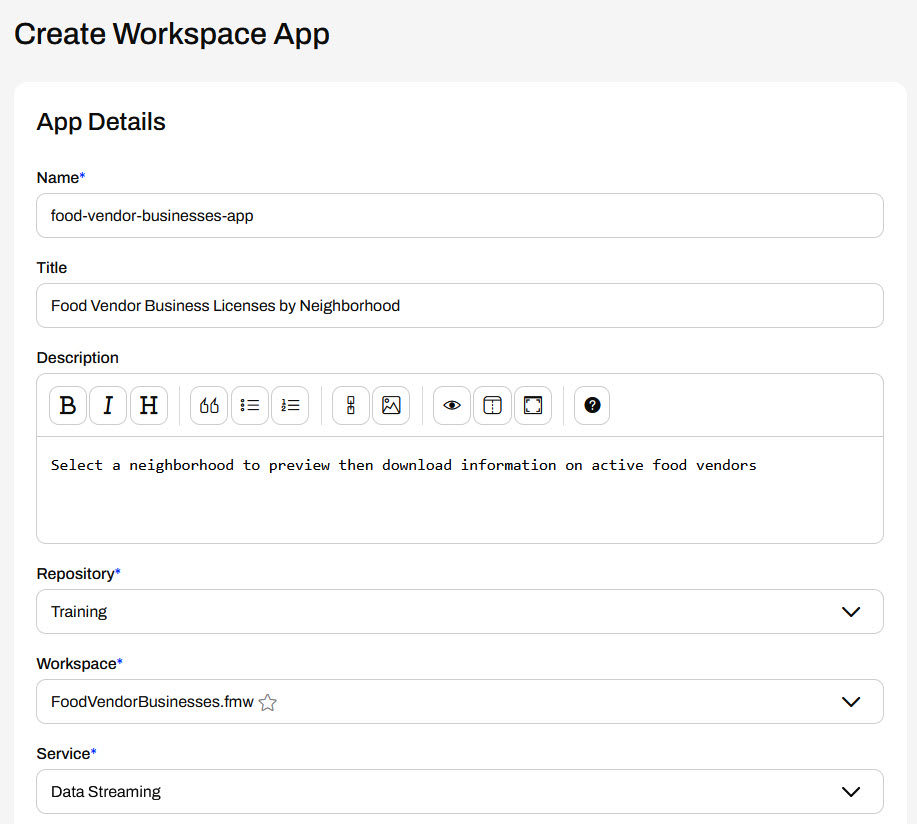 Frank returns to FME Flow and opens Create Workspace App. He gives his app a name, title, and description. Frank then selects the FoodVendorBusinesses.fmw workspace from the Training repository and selects the Data Streaming service.