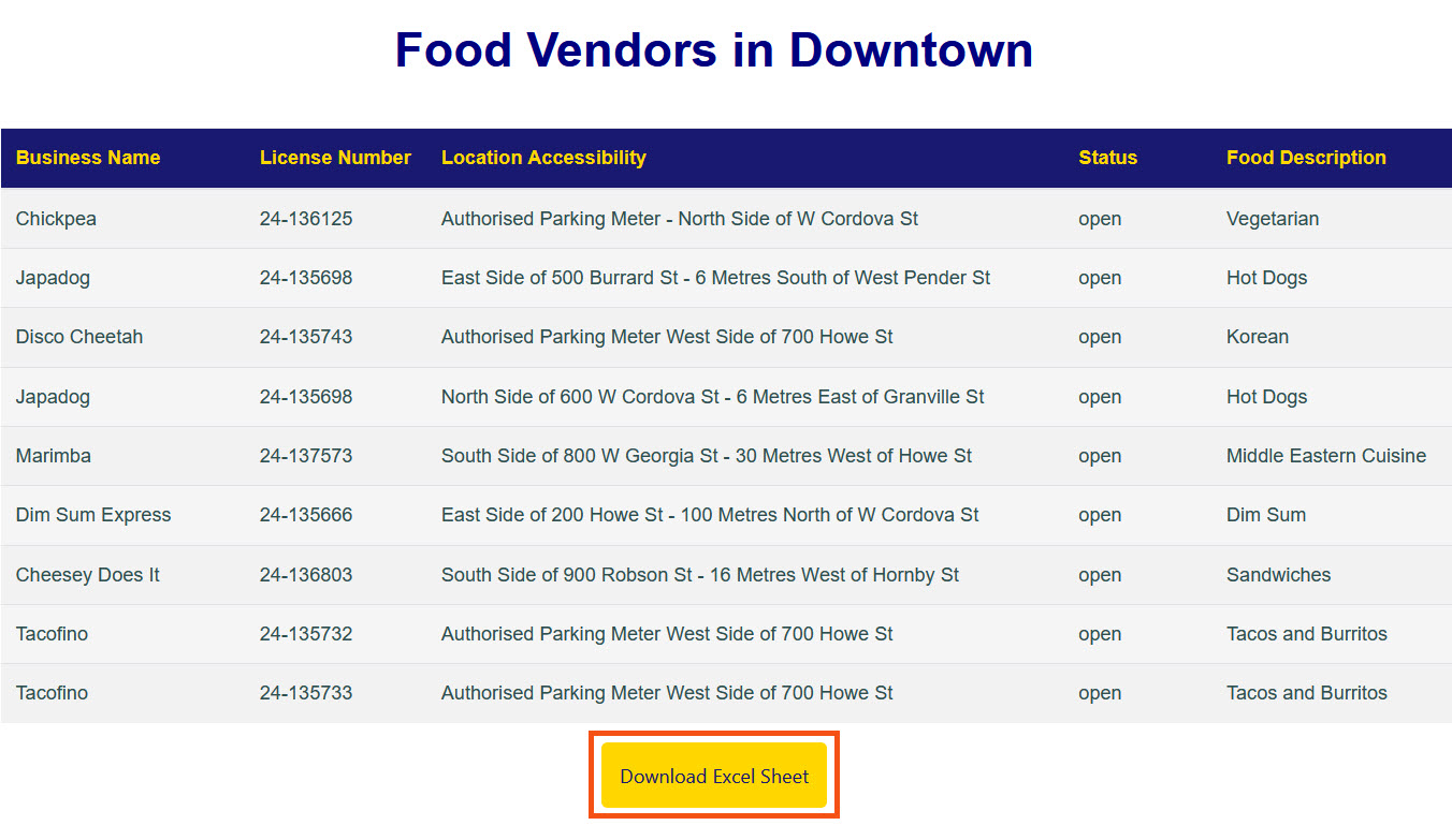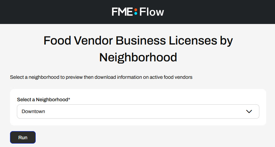 Frank is a GIS administrator working on a self-serve FME Flow App. His colleagues often ask him for business license data on food vendors. He frequently sends his colleagues data, and then they have follow-up requests for more data or different types of data. To make the data accessible to his colleagues and save himself time and effort in preparing the data, Frank is going to create a Workspace App that previews the data before downloading it. To accomplish this, Frank will create a Workspace App to run his workspace using the Data Streaming service. The workspace will stream an HTML report with a tabular preview of the data, and then provide a link to download the data. The link will be a Webhook URL that runs the same workspace as the app, but uses the Data Download service instead.