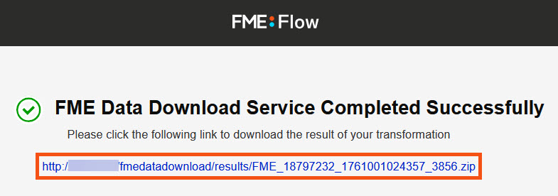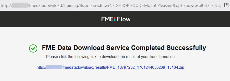 FME Flow reruns the workspace through the Webhook URL. This time, the workspace uses the Data Download service and presents Frank with a URL he clicks to download the data.