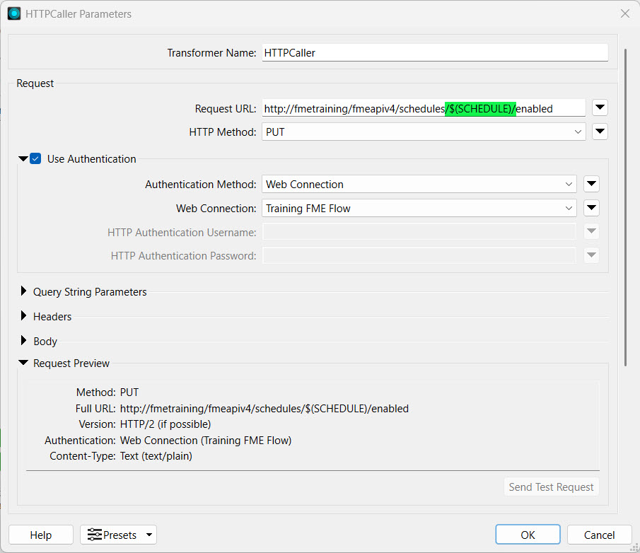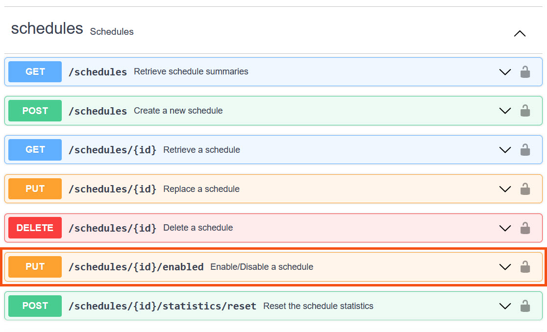 The endpoint takes a single parameter, the schedule ID, as input. You can configure your workspace to enable or disable a single schedule, or use a user parameter to select which Schedule to enable or disable in your FME Flow. You would create a Choice parameter to choose the name of the Schedule, and it would reference the ID.