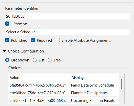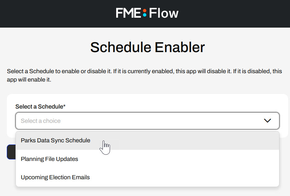 From a Workspace App, the user only sees the Schedule Names from the Choice parameter. When they run the app, the workspace makes an API call to FME Flow to enable or disable the Schedule they've selected.