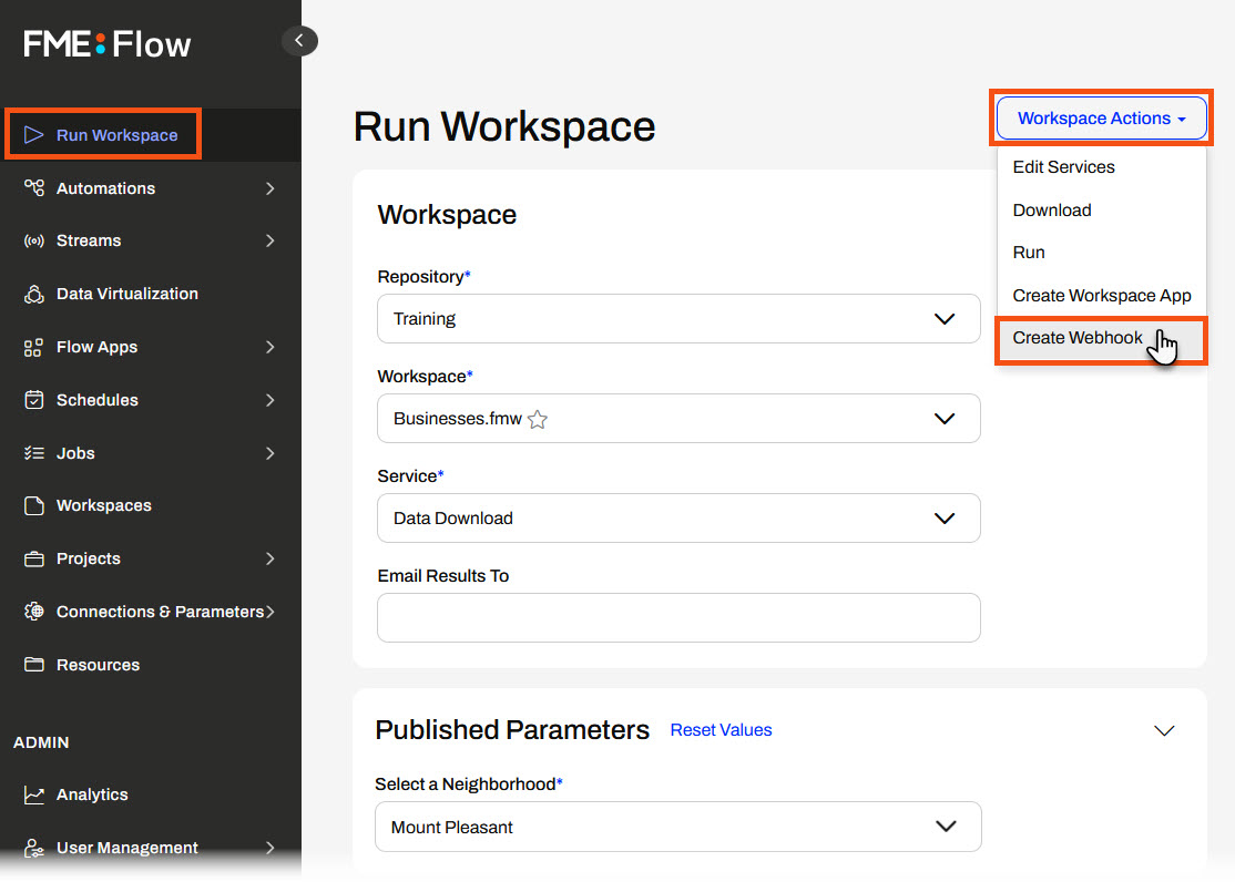 To create a Webhook URL, you configure your workspace to run from the Run Workspace page on FME Flow. Instead of clicking Run, scroll back up to the top, open Workspace Actions, and select Create a Webhook URL.