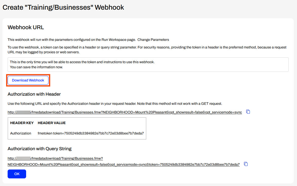 Once you set your parameters and click Create, FME Flow creates the webhook and presents you with the opportunity to download the webhook and its instructions. For security reasons, this is your only opportunity to download this information. FME Flow also creates two URLs that you can use to run the workspace: one that uses Authentication with a Header and one that uses Authorization with a Query String. You may copy the URLs and token here.