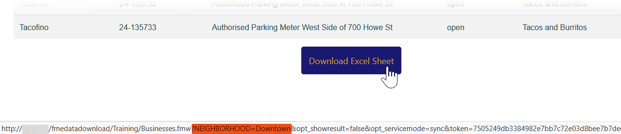 <p><a href="http://fmetraining/fmedatadownload/Training/FoodVendorBusinesses.fmw?NEIGHBORHOOD=$(NEIGHBORHOOD)&opt_showresult=false&opt_servicemode=sync&token=bc71067504bd1d8c44f6820e182a43ed587315b7">Download Excel Sheet</a></p>