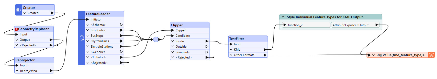 The workspace begins by creating geometry and reprojecting it. The FeatureReader reads in the transit data from Transit.gdb, then a Clipper clips it to the input geometry. If the output format is OGC KML, the workspace styles each feature type before writing it to the file.