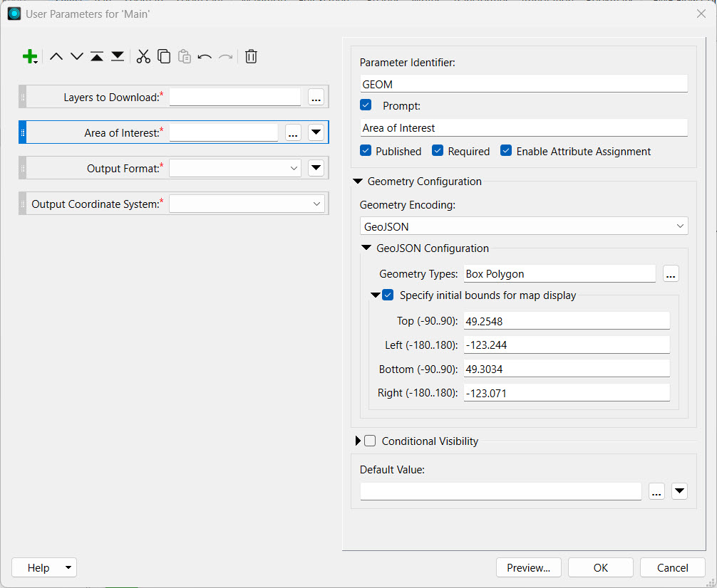For more information on the Geometry Parameter and setting custom basemaps for the web map in FME Flow, please see Using the Geometry Parameter.