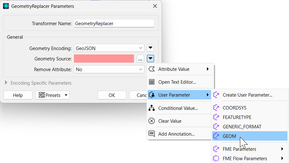 The GeometryReplacer transformer is incomplete, as it requires a reference to a geometry source. This source will be the Geometry parameter Jennifer just created. She double-clicks the GeometryReplacer to open its parameters. She clicks the down arrow for the Geometry Source and selects the GEOM parameter under User Parameters.