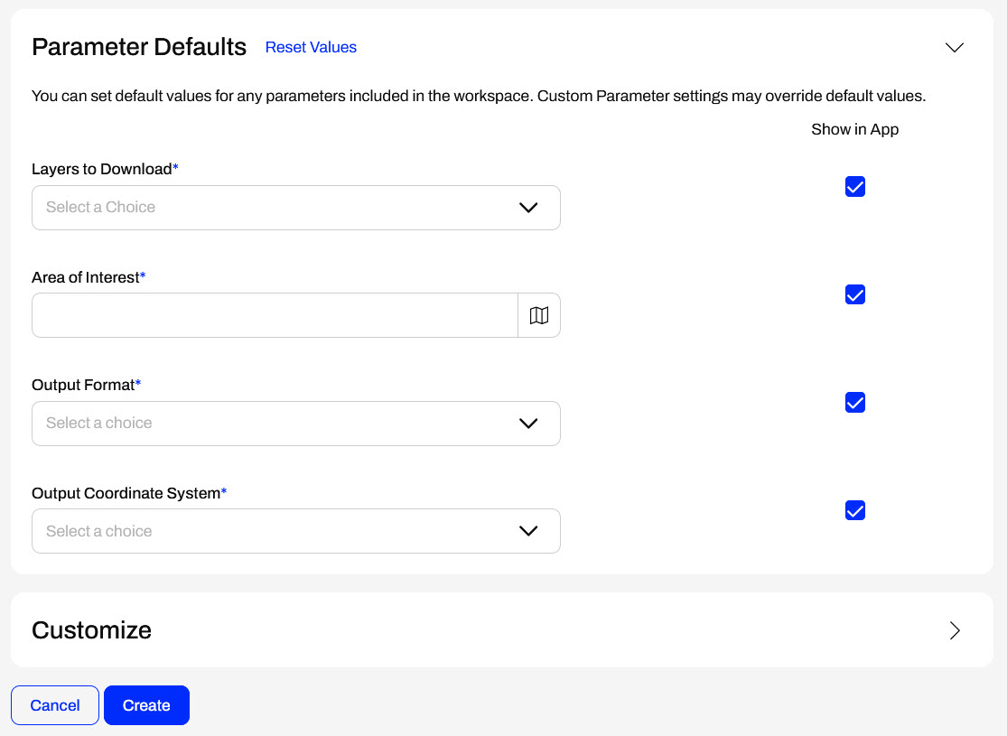 Under Parameter Defaults, Jennifer sees the four parameters from her workspace, including the Area of Interest geometry parameter she just created. She does not alter any other settings and clicks Create.
