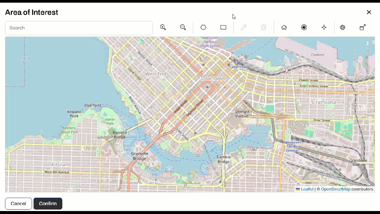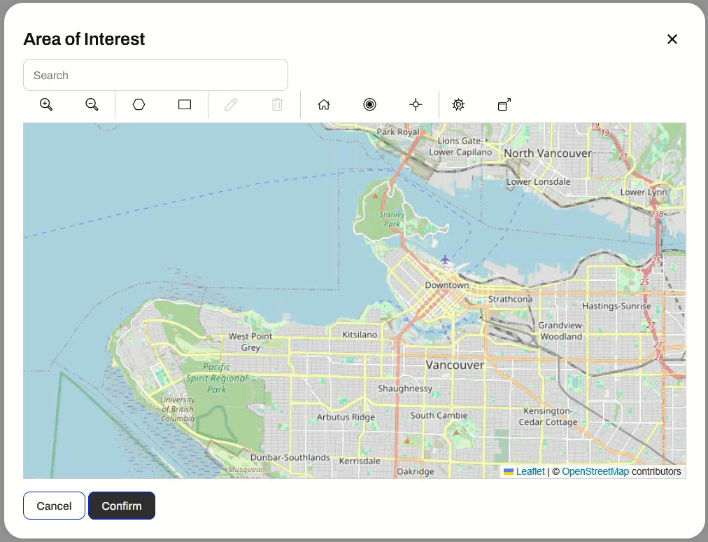On the app, Jennifer selects the transit layers she wishes to download. She clicks the map icon to open the interactive web map to select her Area of Interest. She chooses a rectangle, draws one on the map, and clicks Confirm to close the web map.
