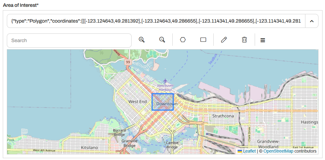 For the Area of Interest parameter, Jennifer copies and pastes the following JSON into the parameter: